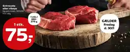 Kvickly Ribeye eller entrecote tilbudRibeye eller entrecote 250-275 gKvickly75,00 kr.16 januar 202622 januar 2026
