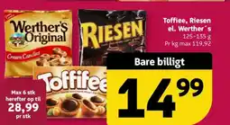 | TOFFIFEE, RIESEN EL. WERTHER'S 125-135 g | Løvbjerg | 15,99 kr. | 05 september 2025 | 11 september 2025 | |||