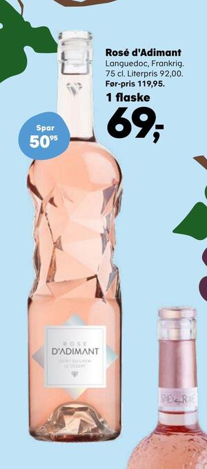 | Rosé d'Adimant | Kvickly | 119,95 kr. | 59,00 kr. | 60,95 kr. Rabat | 21 juni 2024 | 04 juli 2024 | |