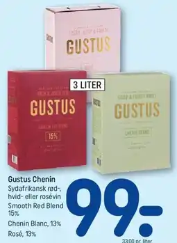 | Gustus (3 liter) - Chenin / Smooth Red Blend / Rosé | REMA 1000 | 99,00 kr. | 26 april 2026 | 02 maj 2026 | |||