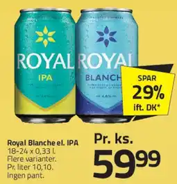 | Royal Blanche el. IPA 18-24 x 0,33 l. | Fleggaard | 84,49 kr. | 59,99 kr. | SPAR 29% | 08 april 2026 | 28 april 2026 | |