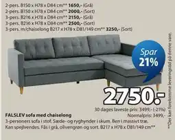 | FALSLEV SOFA MED CHAISELONG | JYSK | 3.299,00 kr. | 2.500,00 kr. | 799,00 kr. Rabat | 01 august 2024 | 15 august 2024 | |