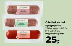 1Kvickly Gårdlykke hel spegepølse tilbudGårdlykke hel spegepølse 220 gKvickly25,00 kr.24 april 202630 april 2026 Se tilbud