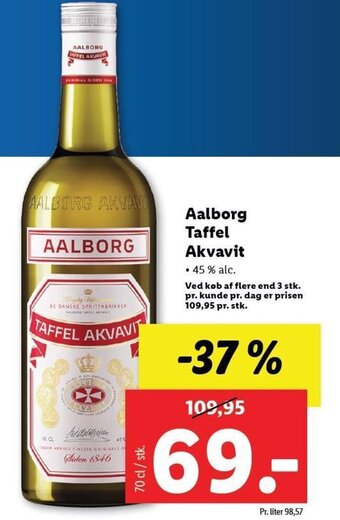 | Aalborg Taffel Akvavit | Lidl | 109,95 kr. | 69,00 kr. | 40,95 kr. Rabat | 23 marts 2023 | 25 marts 2023 | |