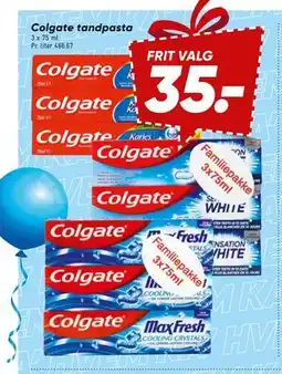 REMA 1000 Colgate tandpasta eller tandbørste til børn eller voksne 50 ml./1 stk tilbudColgate tandpasta eller tandbørste til børn eller voksne 50 ml./1 stk 1 stk.REMA 100010,00 kr.11 januar 202617 januar 2026