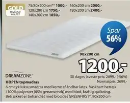 1JYSK HOPEN topmadras tilbudHOPEN topmadras 1 stk.JYSK2.699,00 kr.1.200,00 kr.1.499,00 kr. Rabat17 april 202630 april 2026 Se tilbud