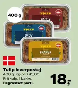 | Tulip leverpostej 400 g | SuperBrugsen | 18,00 kr. | 06 februar 2026 | 19 februar 2026 | |||