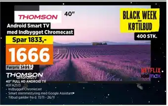 | Thomson 40 full hd android tv 40fa2s13 sort | Power | 3.499,00 kr. | 29 oktober 2020 | 31 januar 2024 | |||