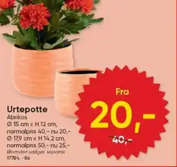 Denne uge finder du flere tilbud på Urtepotte hos blandt andet BigDollar og andre store kæder. Der er kampagner som 25 procent rabat, op til 40 procent besparelse eller ekstra lave priser på Urtepotte, Urtepotte og Urtepotte. Du kan filtrere efter type, størrelse eller forhandler.