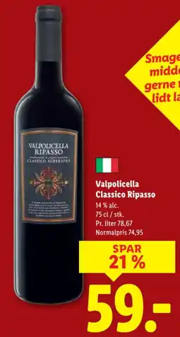 | 1 | Valpolicella Classico Ripasso 75 cl | Lidl | 74,95 kr. | 59,00 kr. | SPAR 21% | 15 marts 2026 | 22 marts 2026 | Se tilbud | |