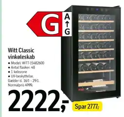 Føtex Witt Classic vinkøleskab tilbudWitt Classic vinkøleskabFøtex4.999,00 kr.2.222,00 kr.Spar 2777,-16 januar 202629 januar 2026
