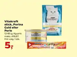 Kvickly Vitakraft stick, purina gold eller perle tilbudVitakraft stick, purina gold eller perle 12-85 gKvickly5,00 kr.01 januar 202608 januar 2026