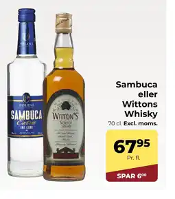 | 1 | Sambuca eller Wittons Whisky 70 cl. | Dagrofa S-Engros | 73,95 kr. | 67,95 kr. | SPAR 6.00 | 01 januar 2026 | 31 januar 2026 | Se tilbud | |